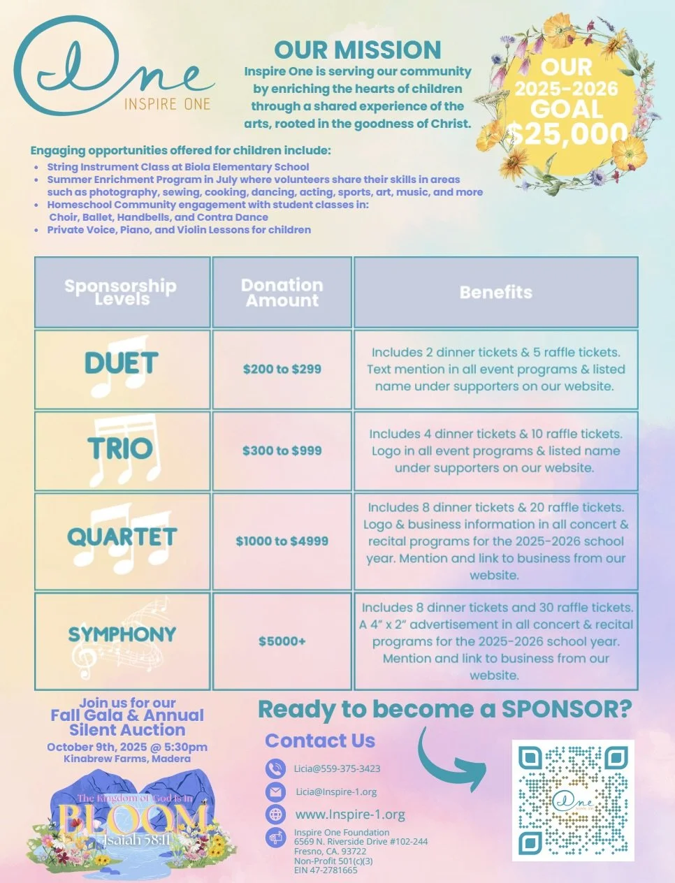Inspire One is making an impact in the lives of young people because of the faithful giving of time of volunteers, work of staff, and financial supporters. It is the generosity of people like you that enables the work of the Inspire One Foundation to continue to touch lives and accomplish our mission of educating children in the creative arts while building cross-cultural and socioeconomic bridges. Thank you for considering how you can partner with us through your financial support! (Your gift is tax deductible. We are an exempt non-profit organization as described in Section 501(c)(3) of the Internal Revenue Code; EIN # 47-2781665).